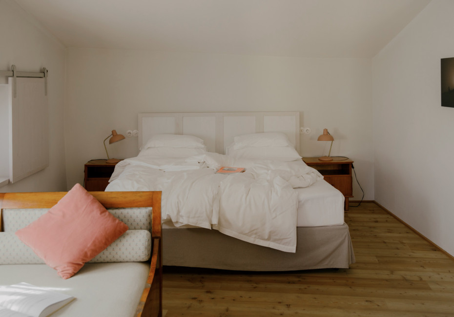 So simpel erklärt ist das 1477 Reichhalter in Lana. Sie trudeln ein, wir erzählen. Sie hören den Bach rauschen, schwenken die Gabel, tanzen durchs Zimmer. Wir rücken das Holztischchen zurecht, ziehen den Teig. Sitzbank mit Pölster im familiengeführten Boutiquehotel Reichhalter in Lana. Das Haus atmet. Seit über einem halben Jahrtausend. Ein und aus. Mit Ihnen.