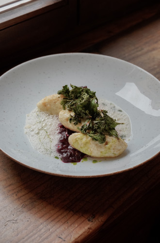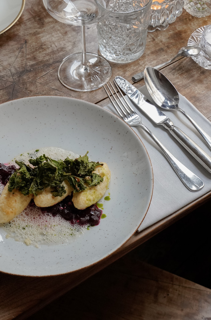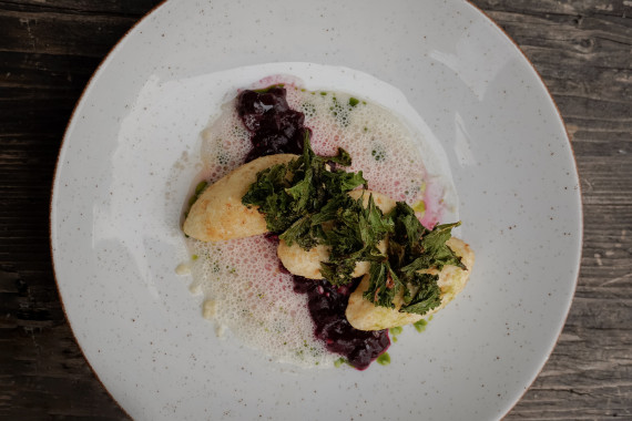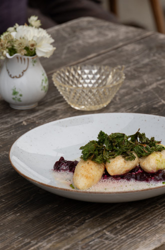 Canederli di Topfen con Crema di Barbabietola e Cavolo Riccio Croccante